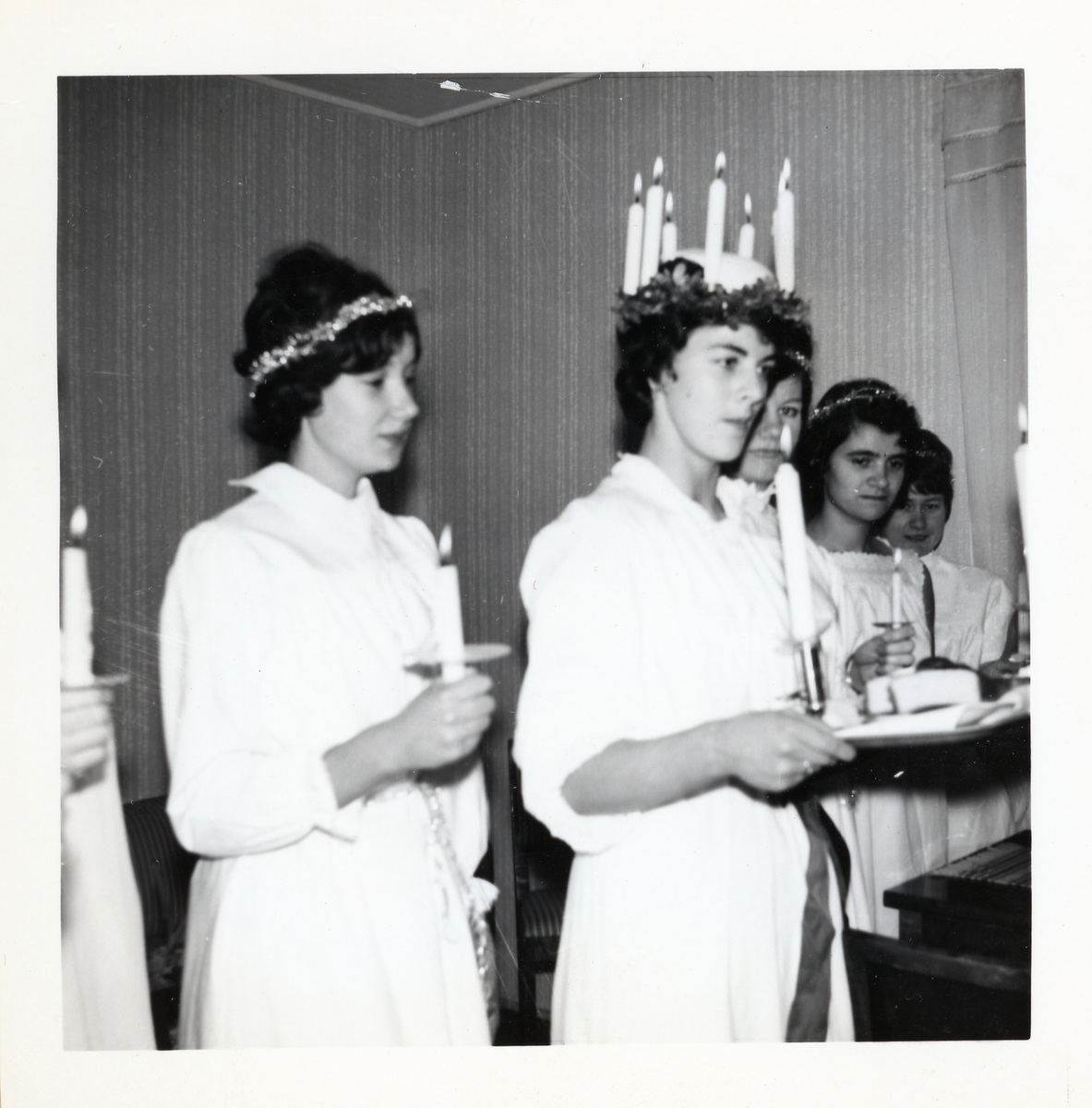 Fotografi på luciafirande med lucia och tärnor vid Lilla Källbäck.
