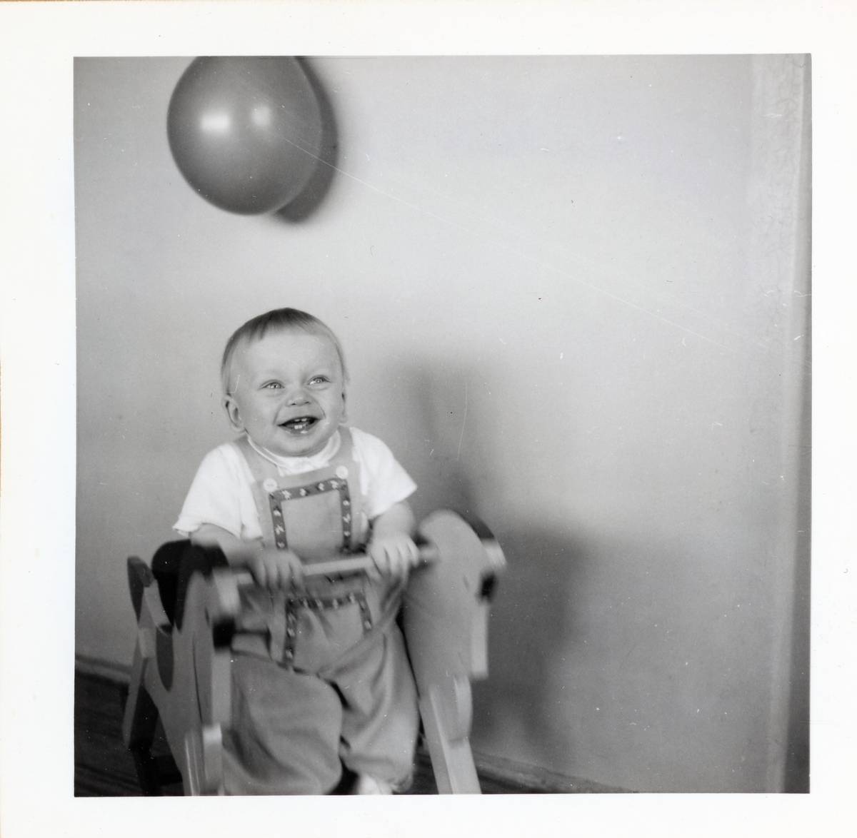 Titel: Fotografi på lilla killen sittandes i en gunghäst "Pigge".