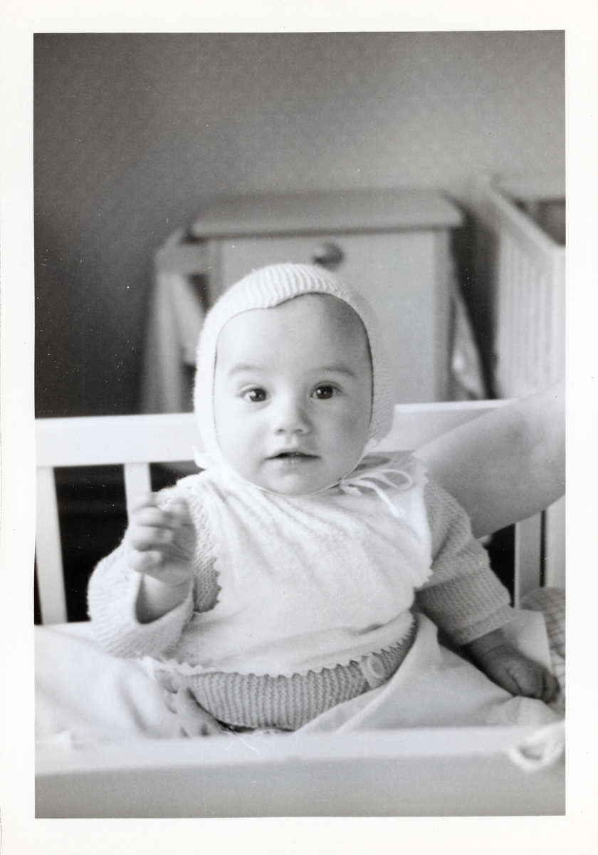 Fotografi på Torbjörn sittande i sin spjälsäng vid Lilla Källbäck.