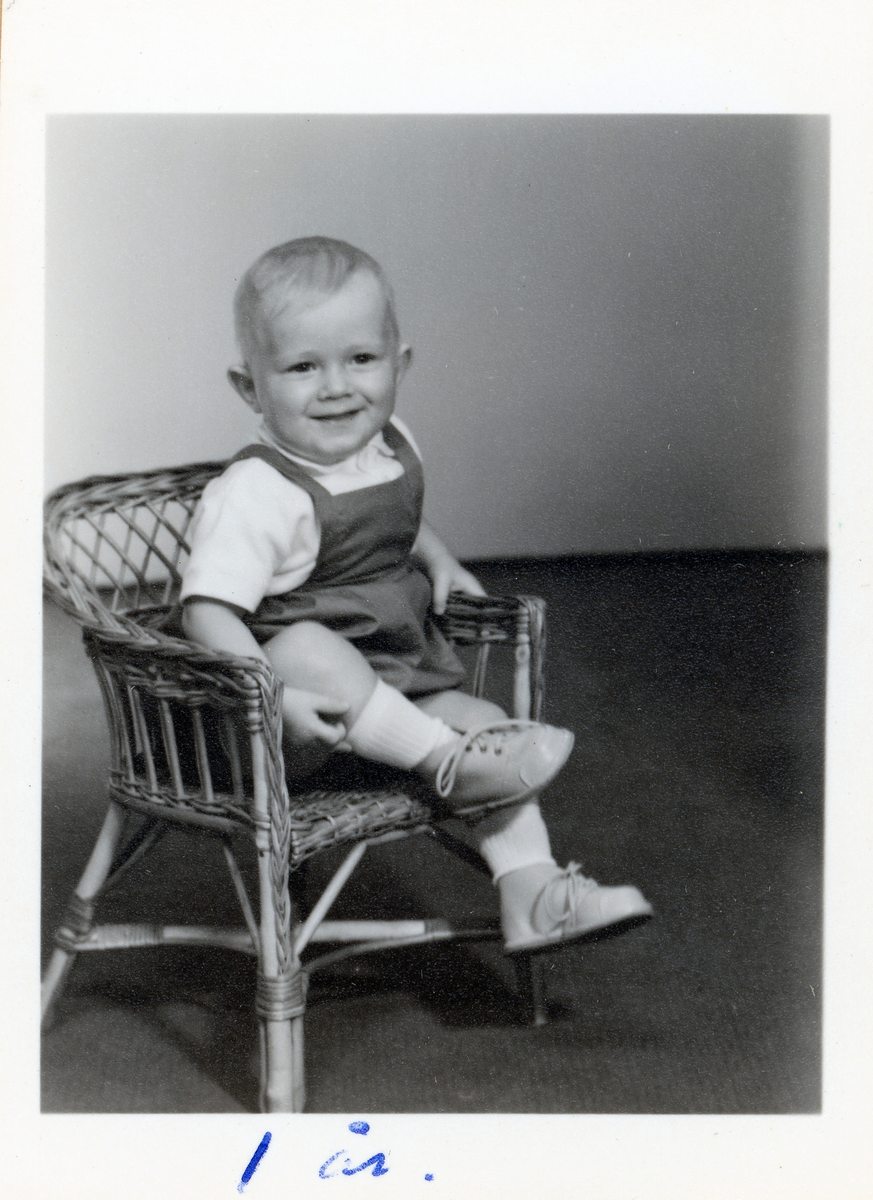 Fotografi på Mikael 1 år, sittande i en liten korgstol.