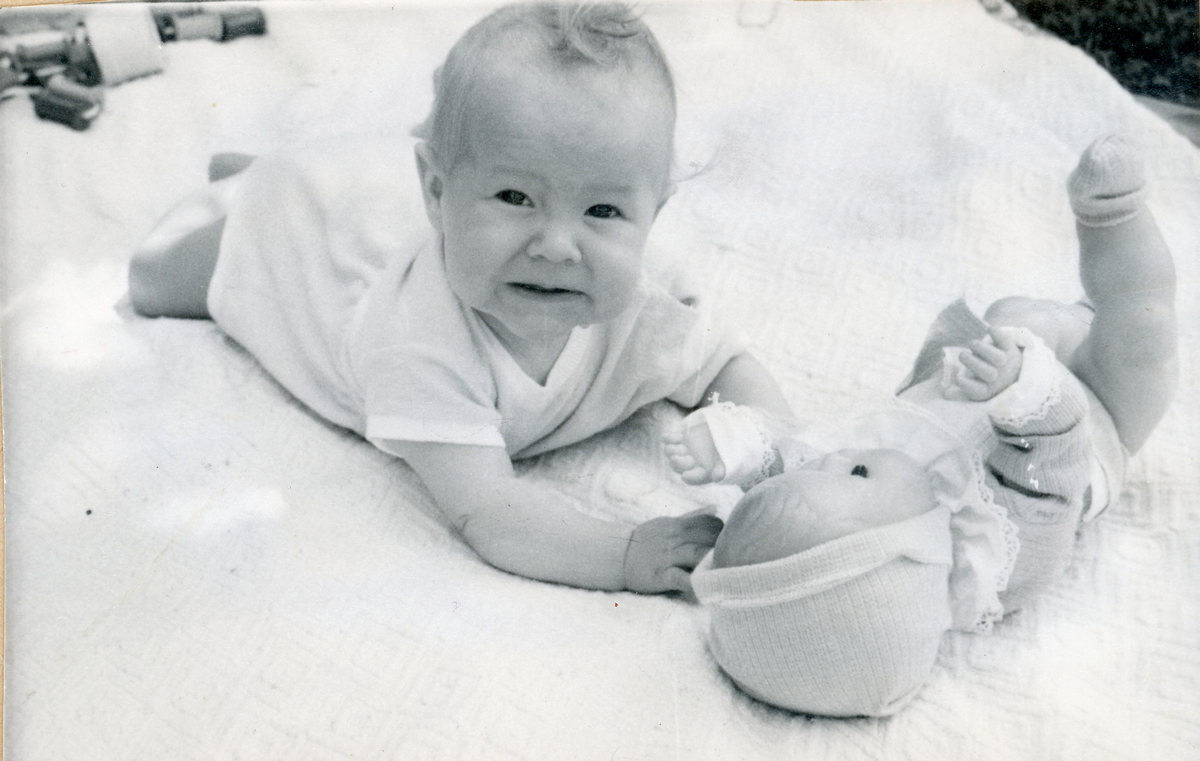 Fotografi på Karin liggandes på magen på en filt med en docka framför sig.