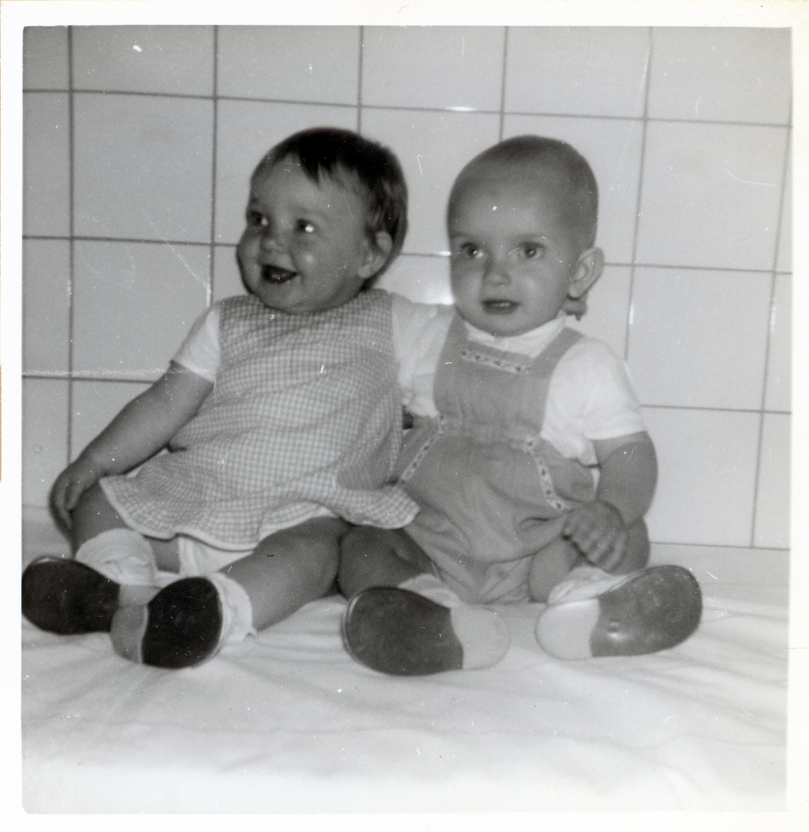 Fotografi på Maud och Urban sittandes, troligen på ett skötbord, och håller om varandra i Lilla Källbäck.