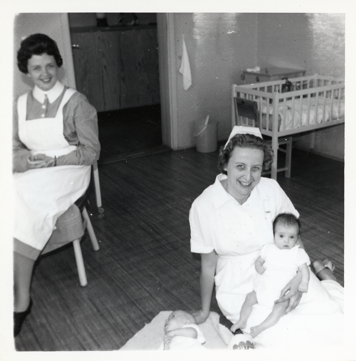 Fotografi på två barnsköterskor varav den ena är Barbro Holmström, maj 1960.