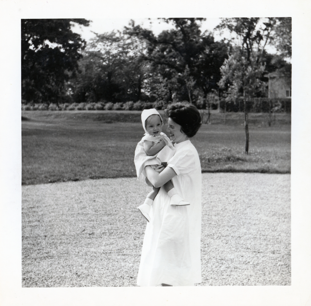 Fotografi på en barnsköterska med Eva 1år i sin famn troligen vid Lilla Källbäck.