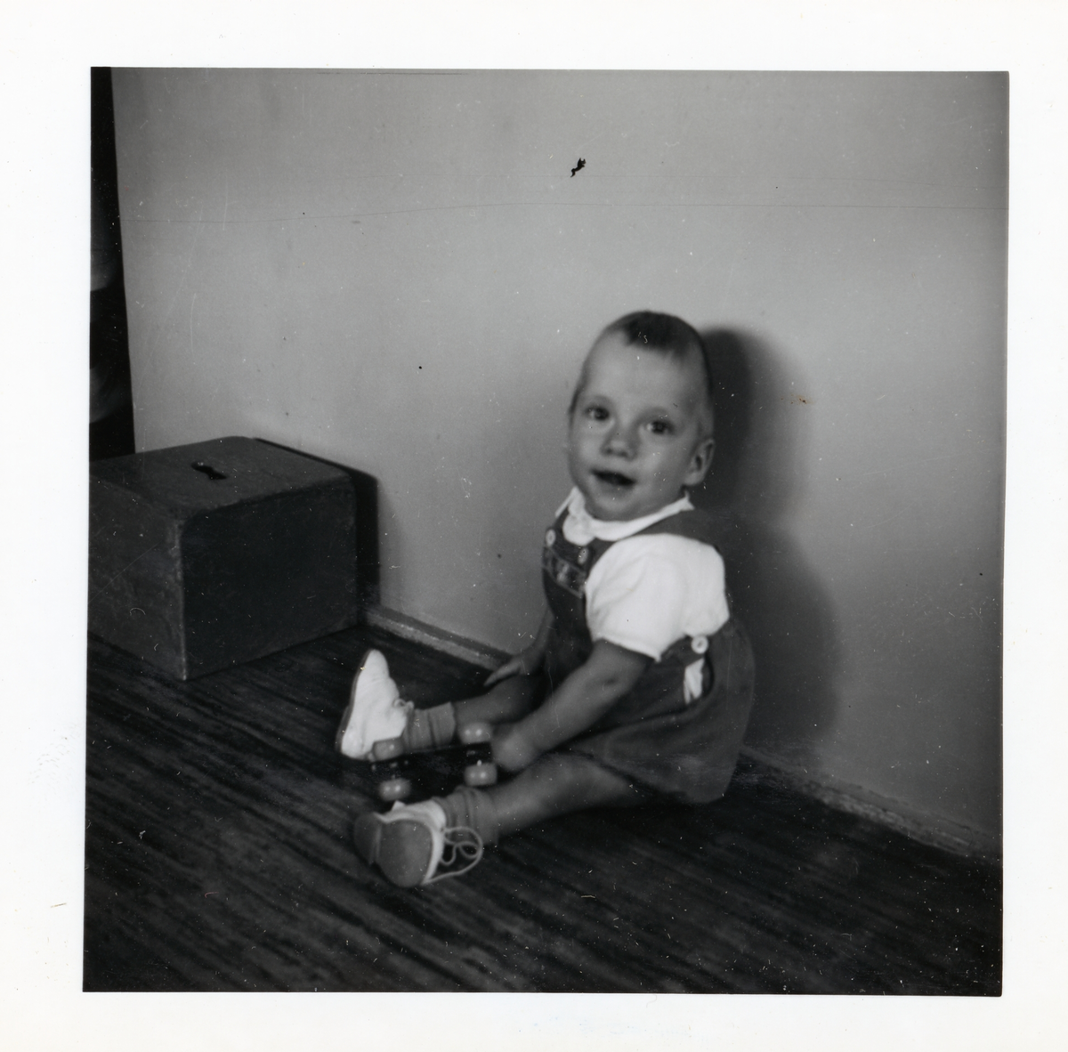 Titel: Fotografi på Janne sittande på golvet med leksak i Lilla Källbäck.