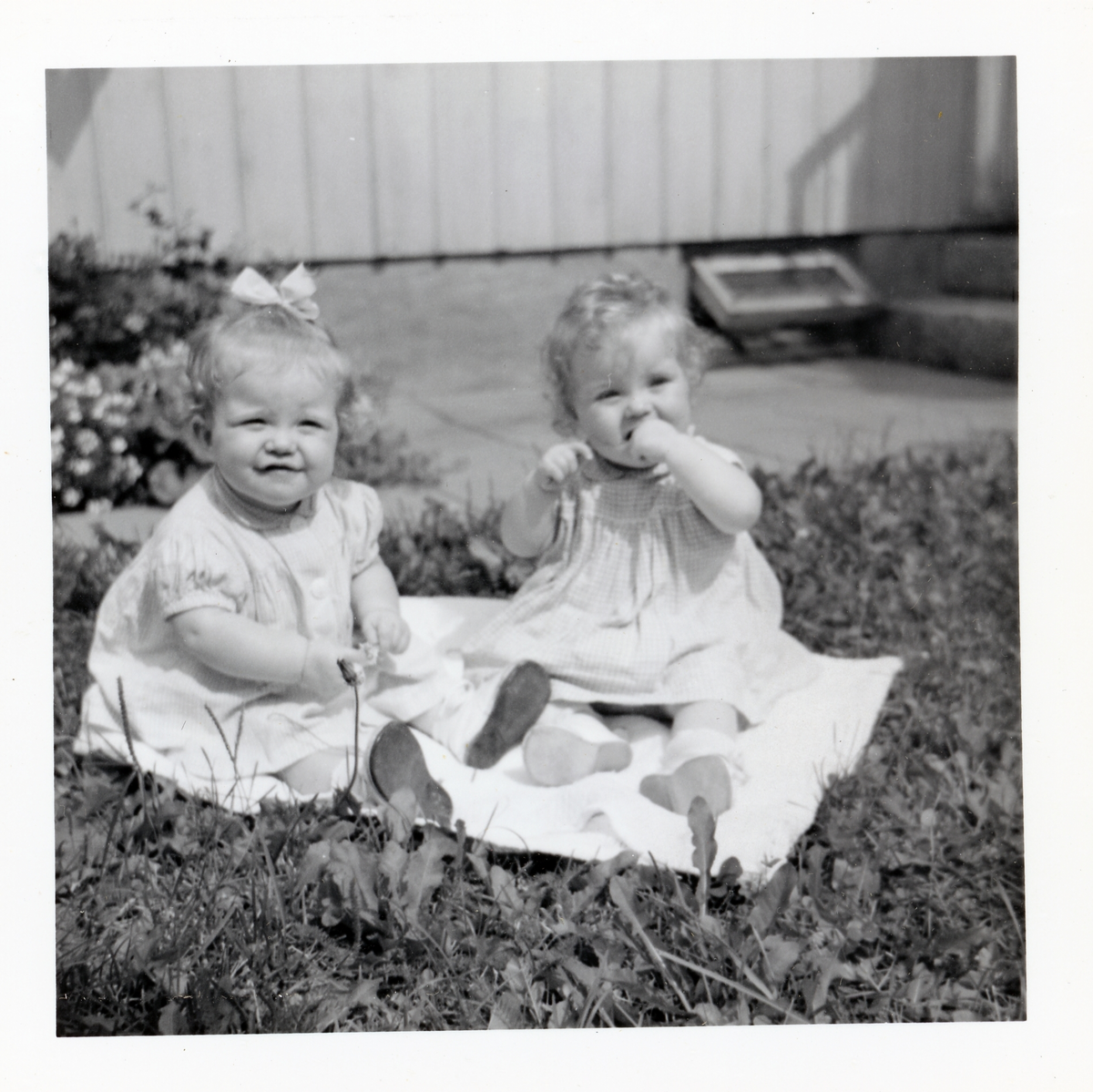 Fotografi på två små flickor med klänningar som sitter på en filt i gräset, troligen vid Lilla Källbäck.