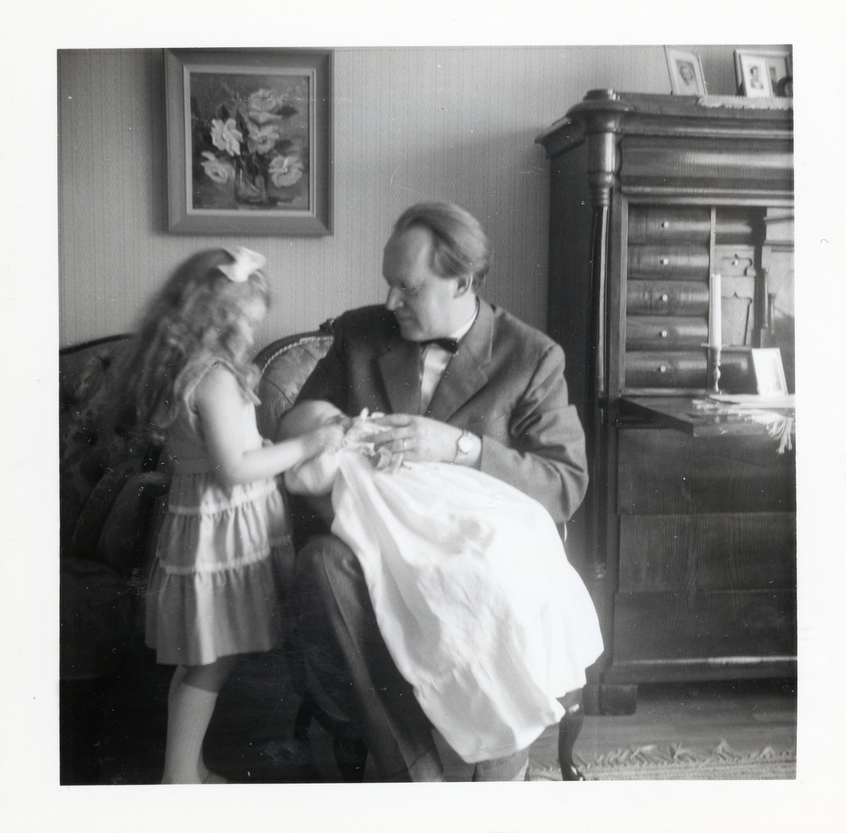 Fotografi på en pappa med två barn varav ett skall troligen döpas då det har en dopklänning.