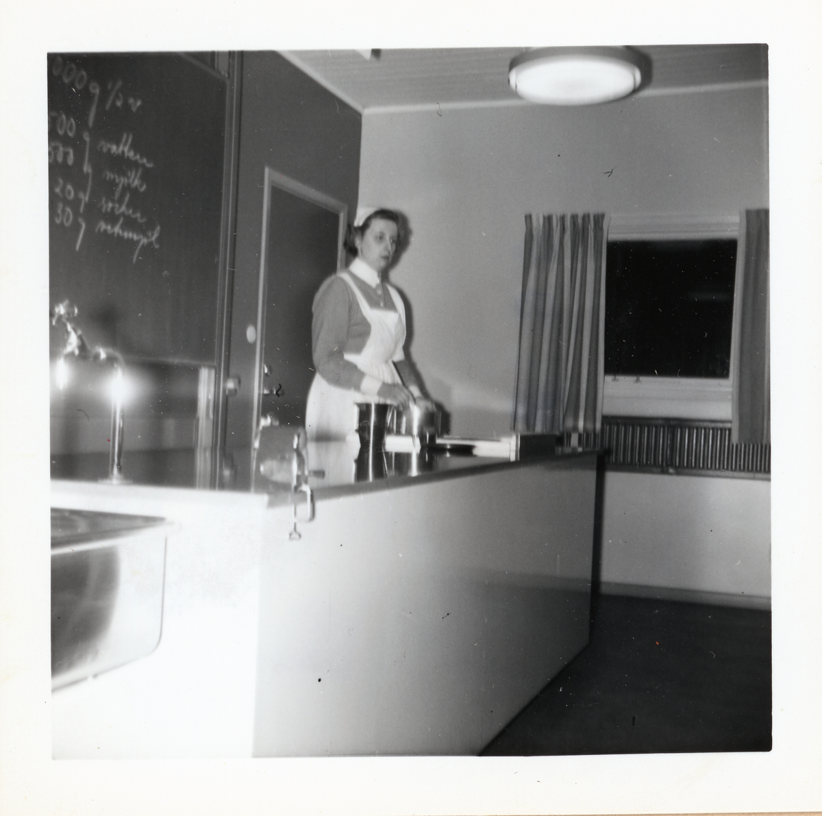 Fotografi på en barnsköterska i teorilokalen på Lilla Källbäck, färdig att användas 1:a september 1962.