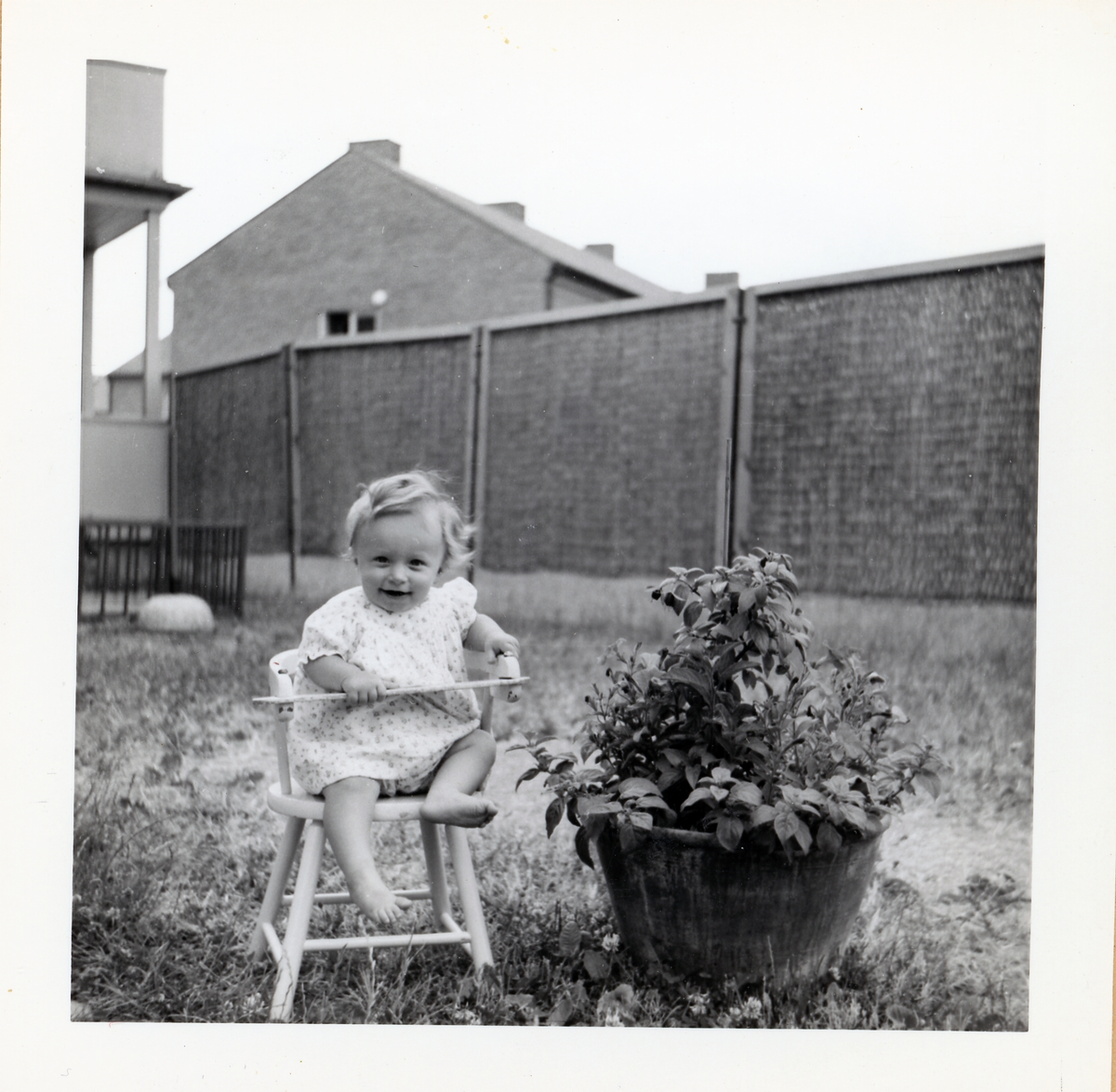 Fotografi på Majvor sittande i en liten barnstol en sommardag i Lilla Källbäck.