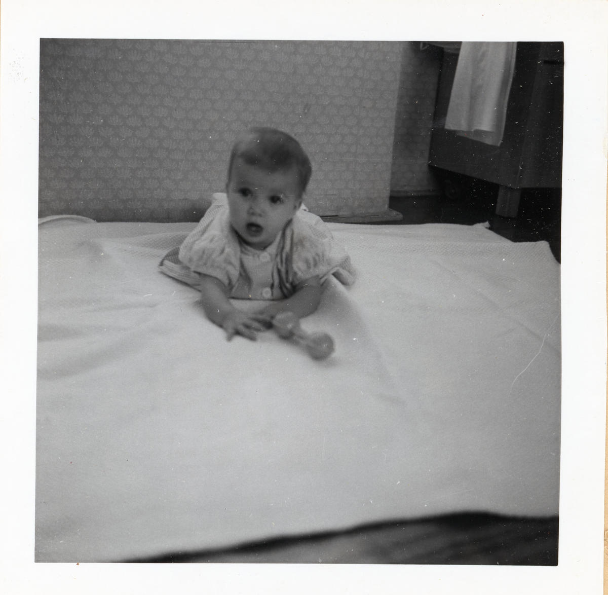 Titel: Fotografi på Marina liggandes på en filt med en leksak framför sig i Lilla Källbäck.