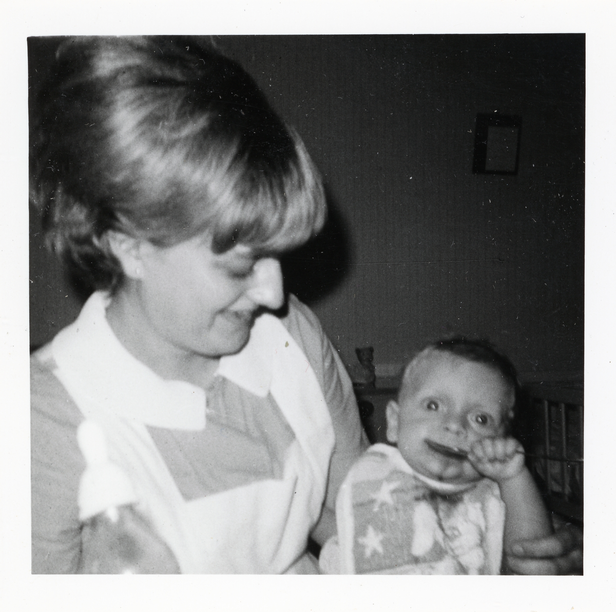 Fotografi på en barnsköterska med ett barn som äter själv i famnen, i Lilla Källbäck.