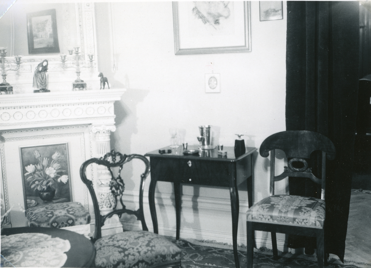 Rumsinteriör med litet bord i rokokostil, stolar, spiselkrans med spegel mm. troligen från Centralpalatset i Gävle stad.