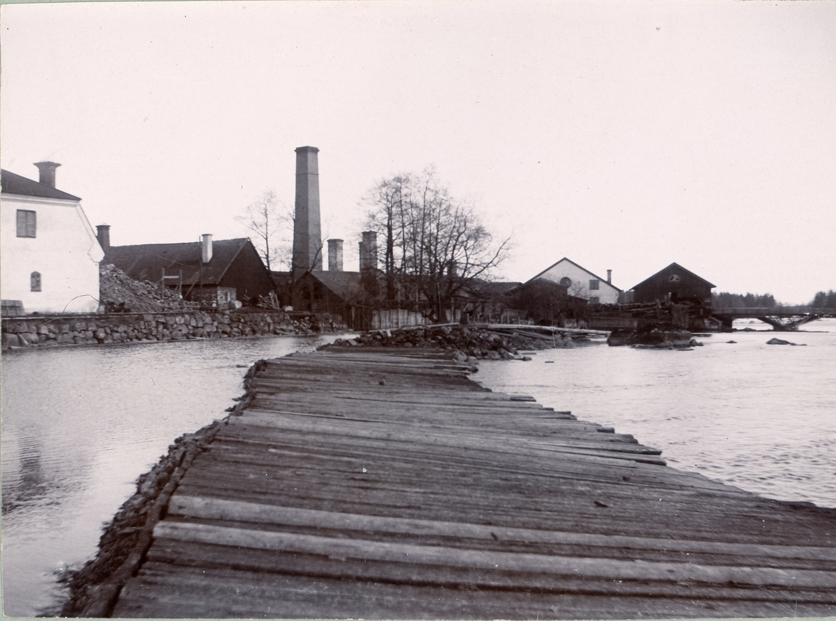 Brygga byggd på sten med bruksbebyggelse i bakgrunden i Gysinge samt skorstenen för järnbruksdriften.