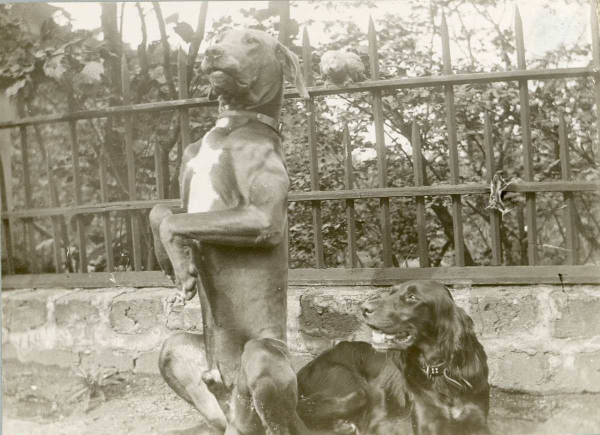 Titel: Två hundar, varav en sitter fint och en ligger, framför ett staket i Gysinge bruk.