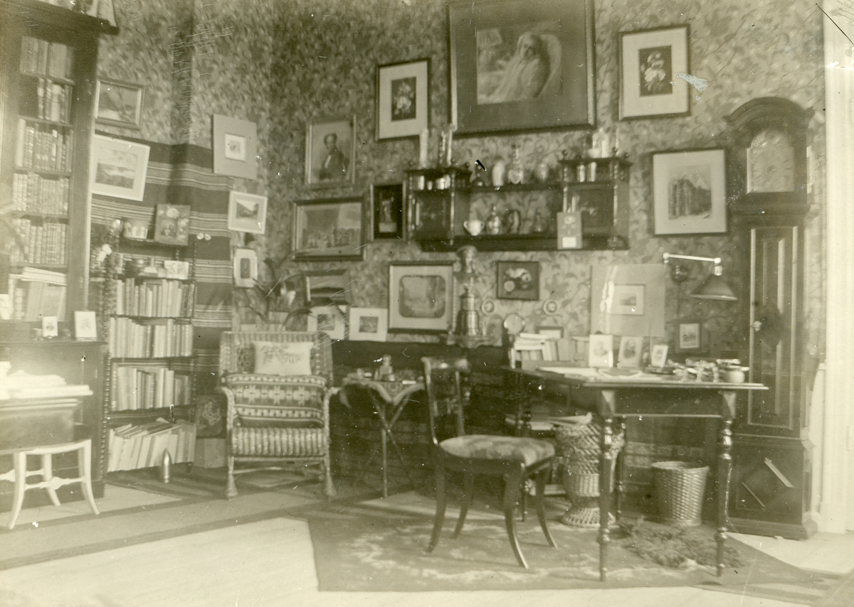 Titel: Fotot visar ett rum med bl.a , skrivbord, bokhyllor, golvur, tavlor mm. troligen biblioteket inifrån Gysinge herrgård.