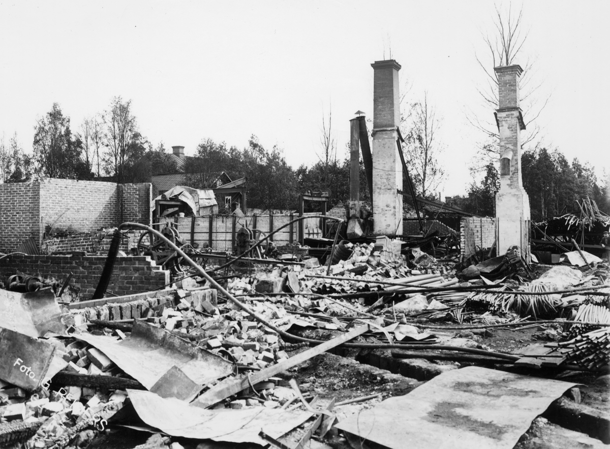 Titel: Eldsvåda 1913, som ödelade större delen av fabriken See Fabrik AB (Seefab). Fabriken startade sin verksamhet 1895 med tillverkning av paraplyspröt. Senare tillverkades även kalldragna stålrör, för t.ex. cykelramar. Fabriken övertogs 1960 av Sandviks AB.