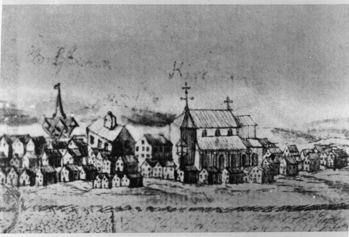 Titel: Heliga Trefaldighets kyrka med stapel jämte skolhuset. Teckning av Gerdes för Svecia Antiqua, slutet av 1600-talet (Kungliga Biblioteket).