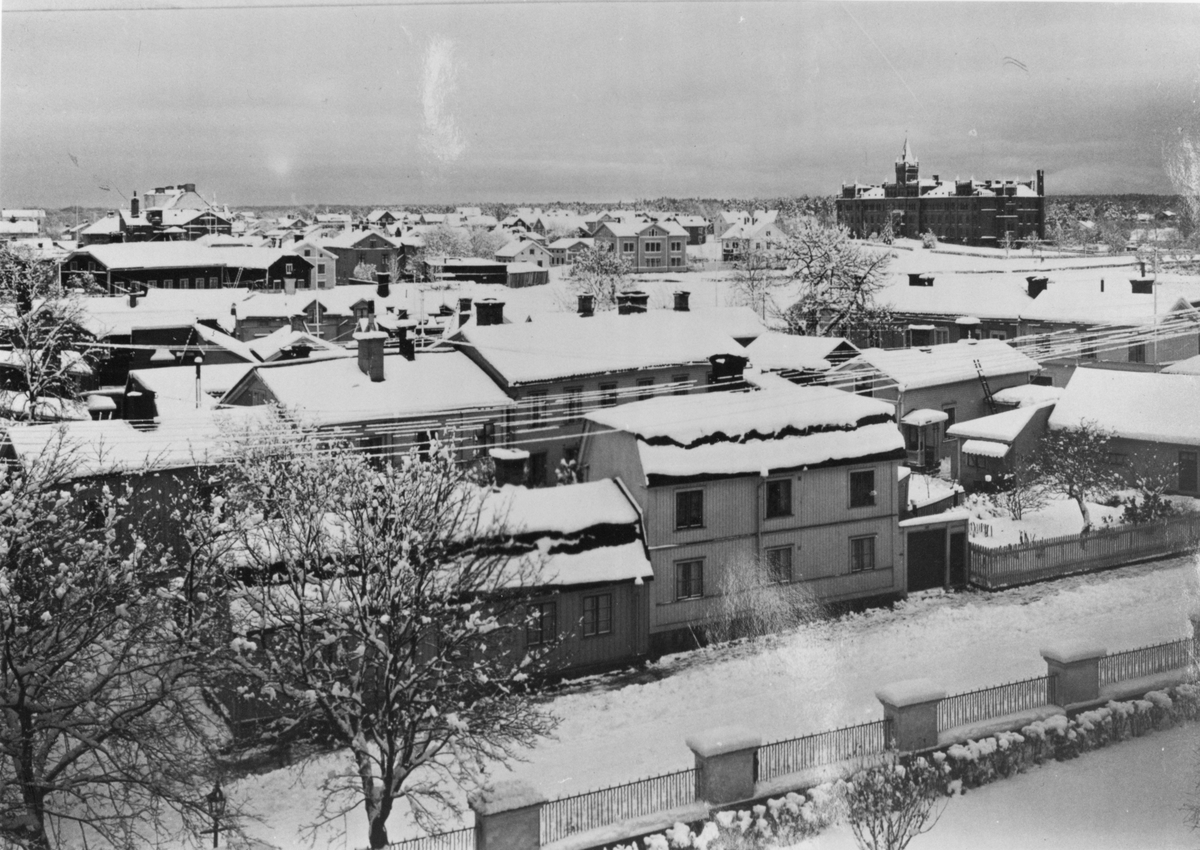 Utsikt från slottet mot sydväst. I bakgrunden Dövstumskolan, senare lärarseminariet, numera Lärarhögskolan.