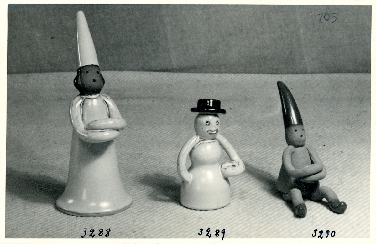 Ljusstakar från Bo Fajans, formgivare Eva Jancke-Björk, 1900-talets mitt. Modeller Stjärngosse 3288, Snögubbe 3289 och Tomte 3290.