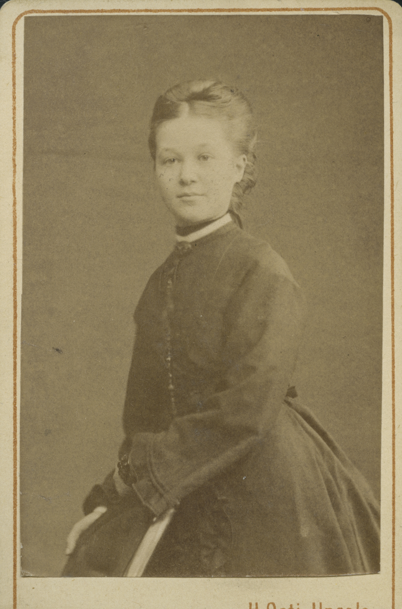 Porträtt av Louise Théel, 23/12 1873. Text på baksida kort: "Med vänlig påminnelse att ej glömma bort Louise".