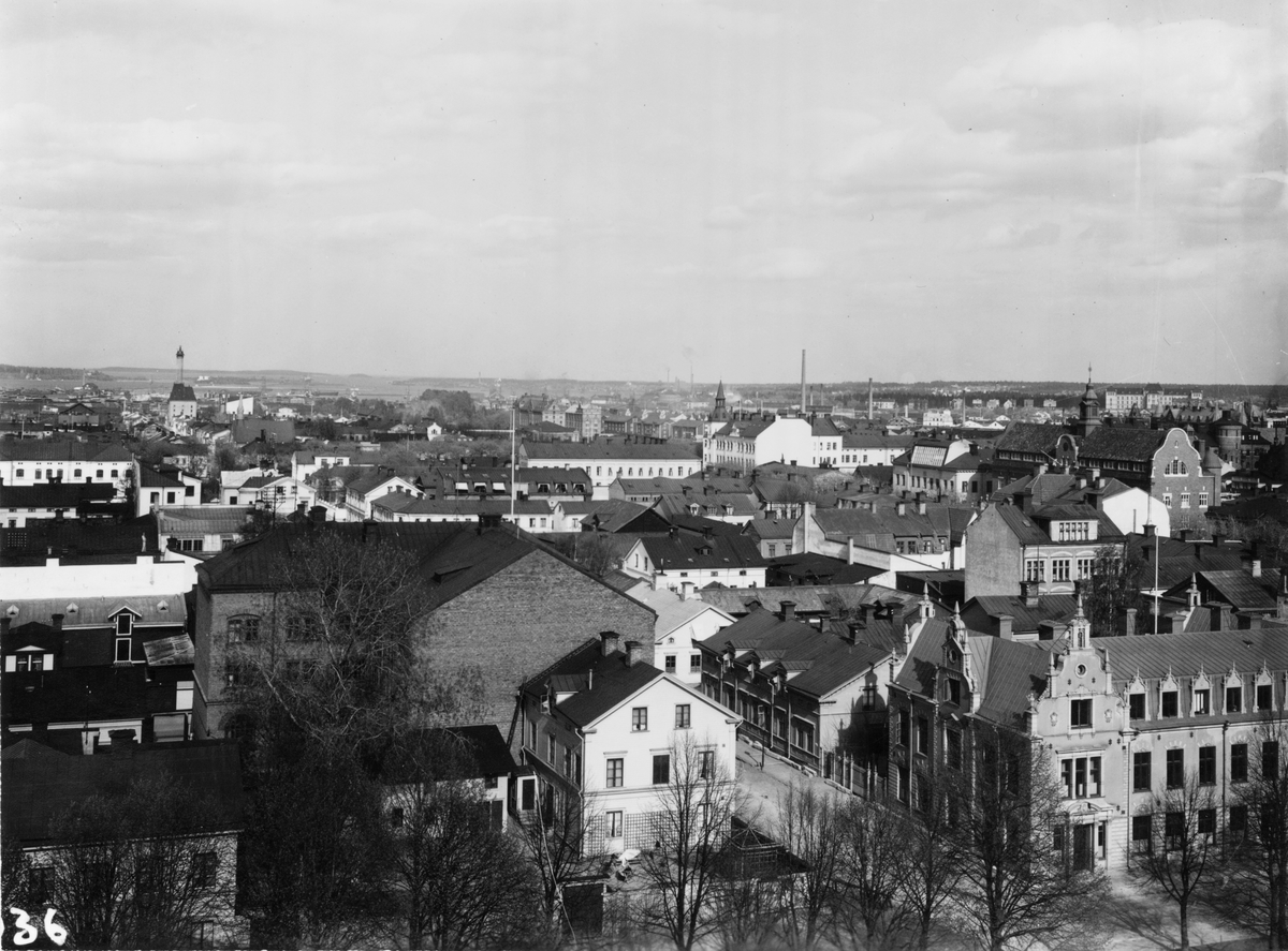 Utsikt över norra och östra stadsdelen. Nere till höger Flickskolan. Skorstenen till vänster i bakgrunden tillhör Maltfabriken vid Ruddamsgatan.