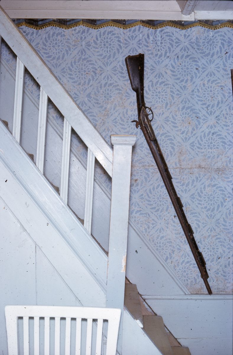 Innertrappa, schablontapet. På väggen jaktgevär. Arbrå hembygdsgård "Fornhemmet".