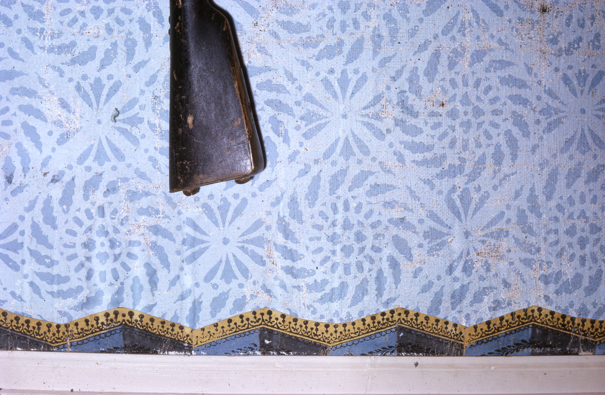 Innertrappa, schablontapet. På väggen jaktgevär. Arbrå hembygdsgård "Fornhemmet".