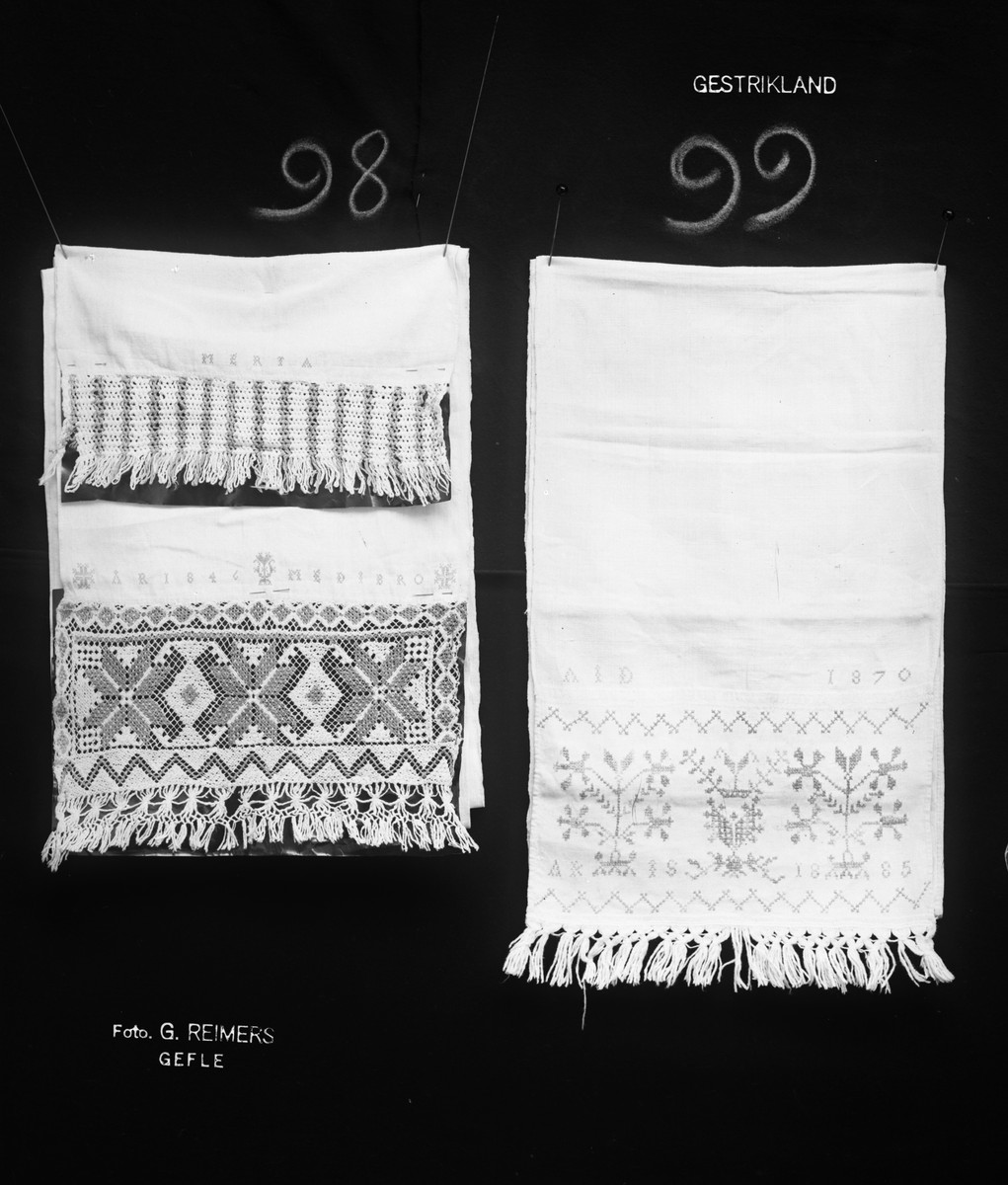 Handkläde med bård i obestämd teknik märkt "MERTA" i korssöm och handkläde med bård i knutet och trätt (pinnspets) märkt "MERT ÅR 1846 MED I BRO" i korssöm (98).