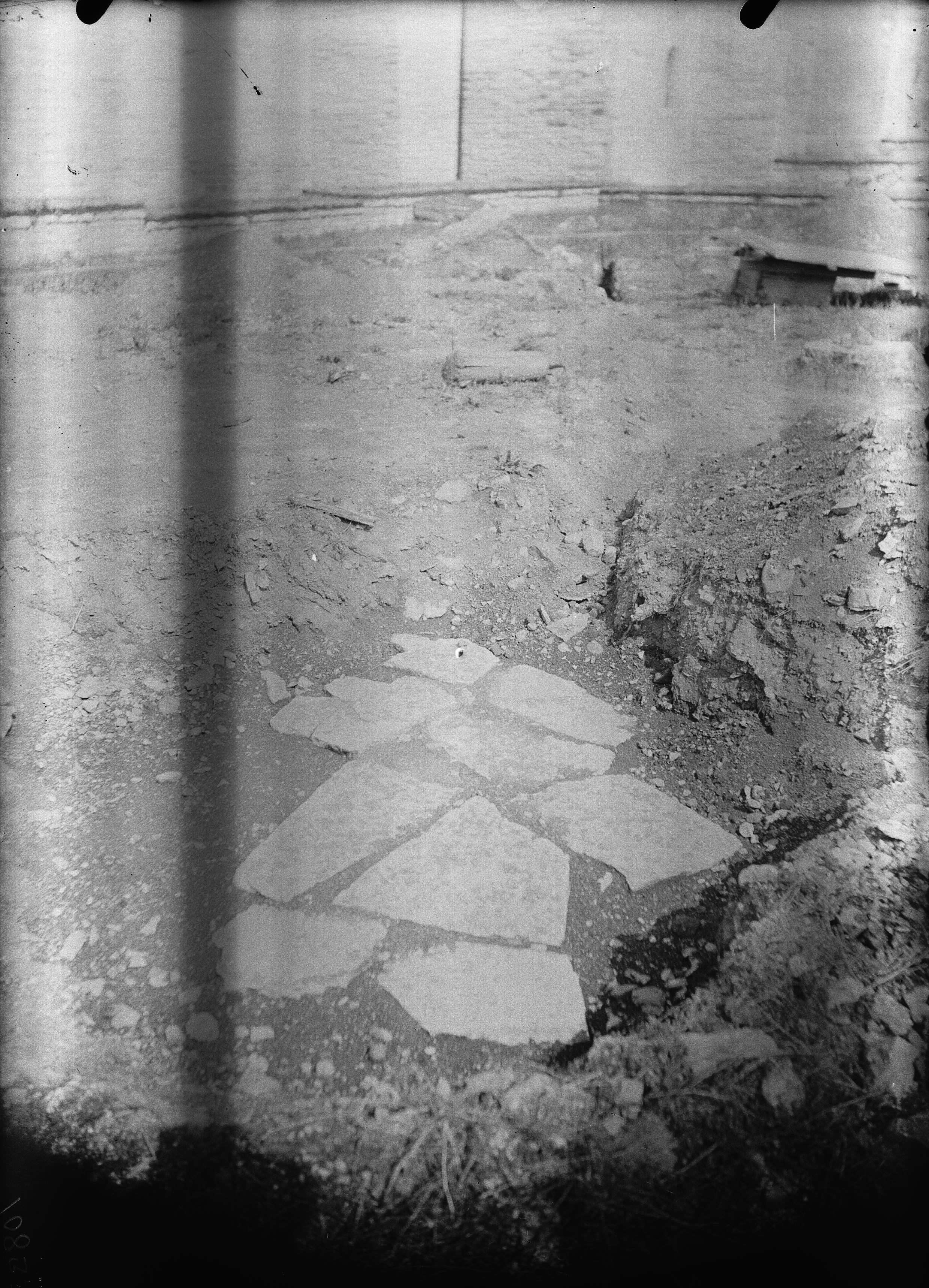 Stensättning under 1200-talsnivå i klosterträdgårdens sydvästra del. Från sydväst.
