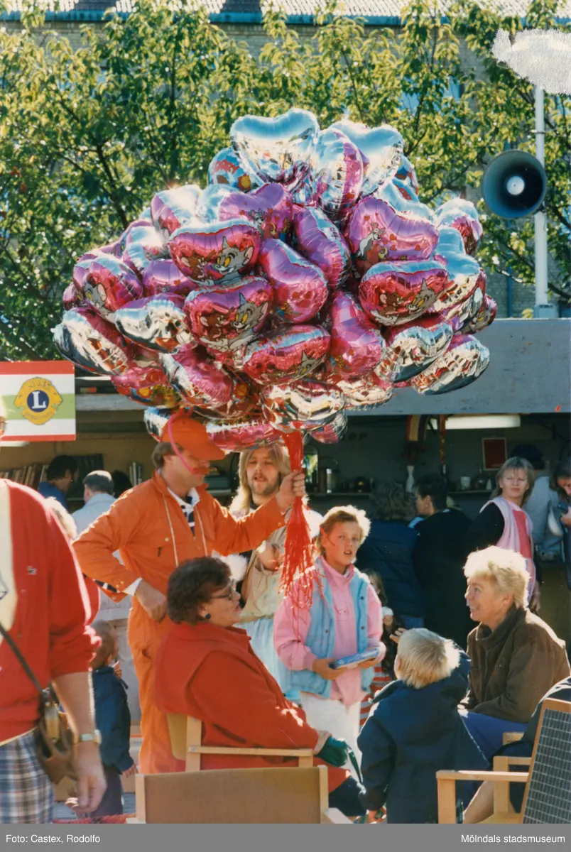 Lions Club anordnar marknad på Stadshusplatsen i Mölndal, tidigt 1980-tal. En man har ballonger till försäljning.