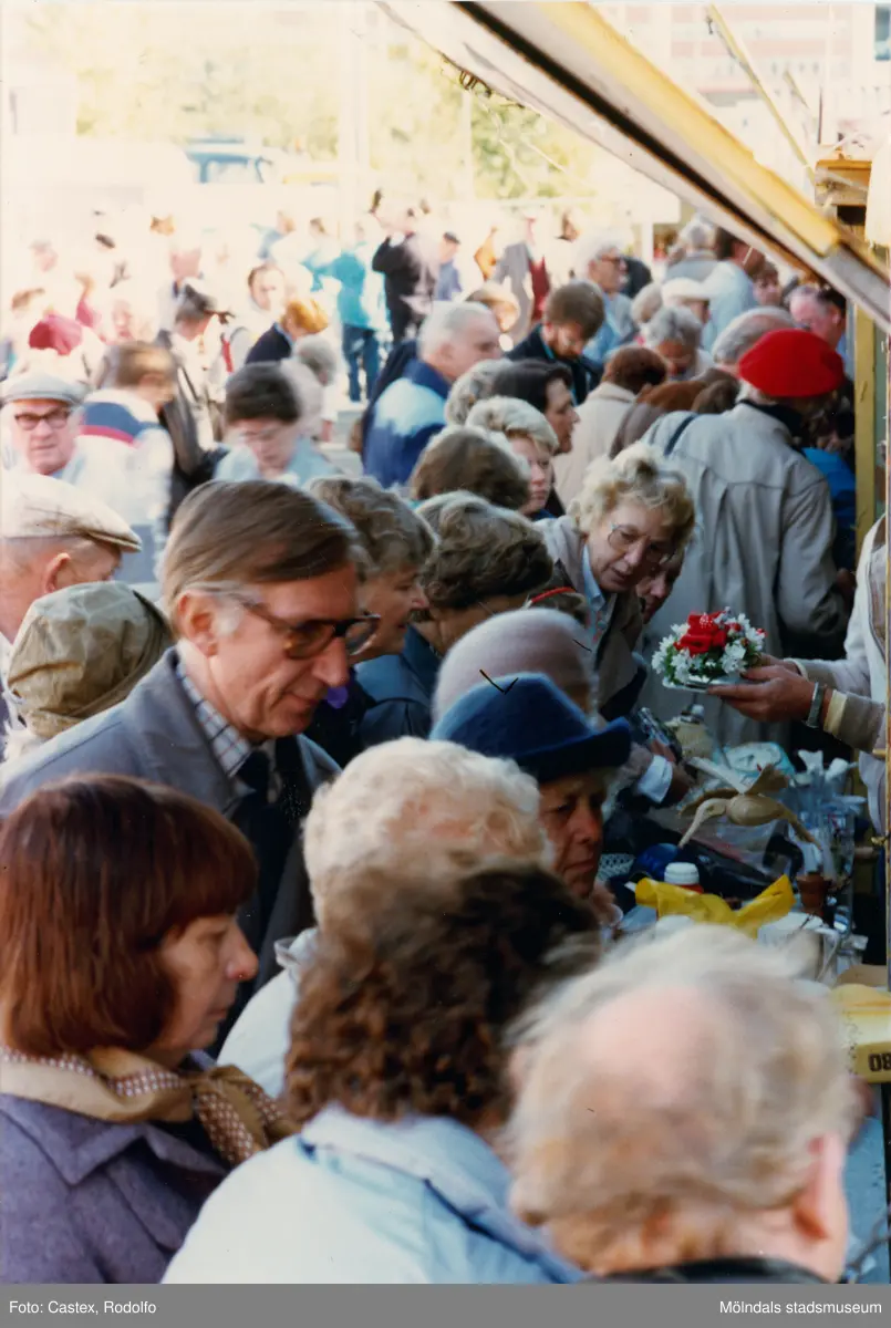 Lions Club anordnar marknad på Stadshusplatsen i Mölndal, tidigt 1980-tal. Kvinnor och män på en välbesökt marknad.