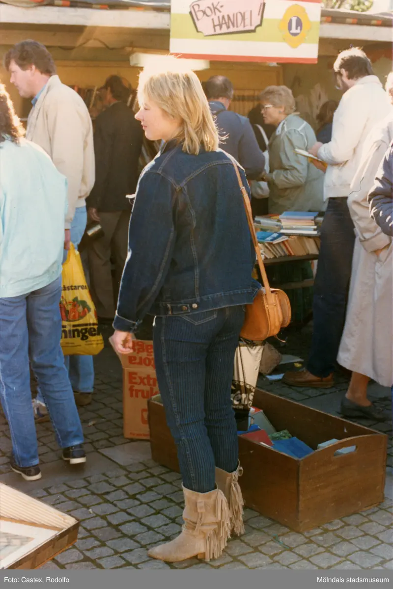 Lions Club anordnar marknad på Stadshusplatsen i Mölndal, tidigt 1980-tal. En kvinnlig besökare på marknaden.