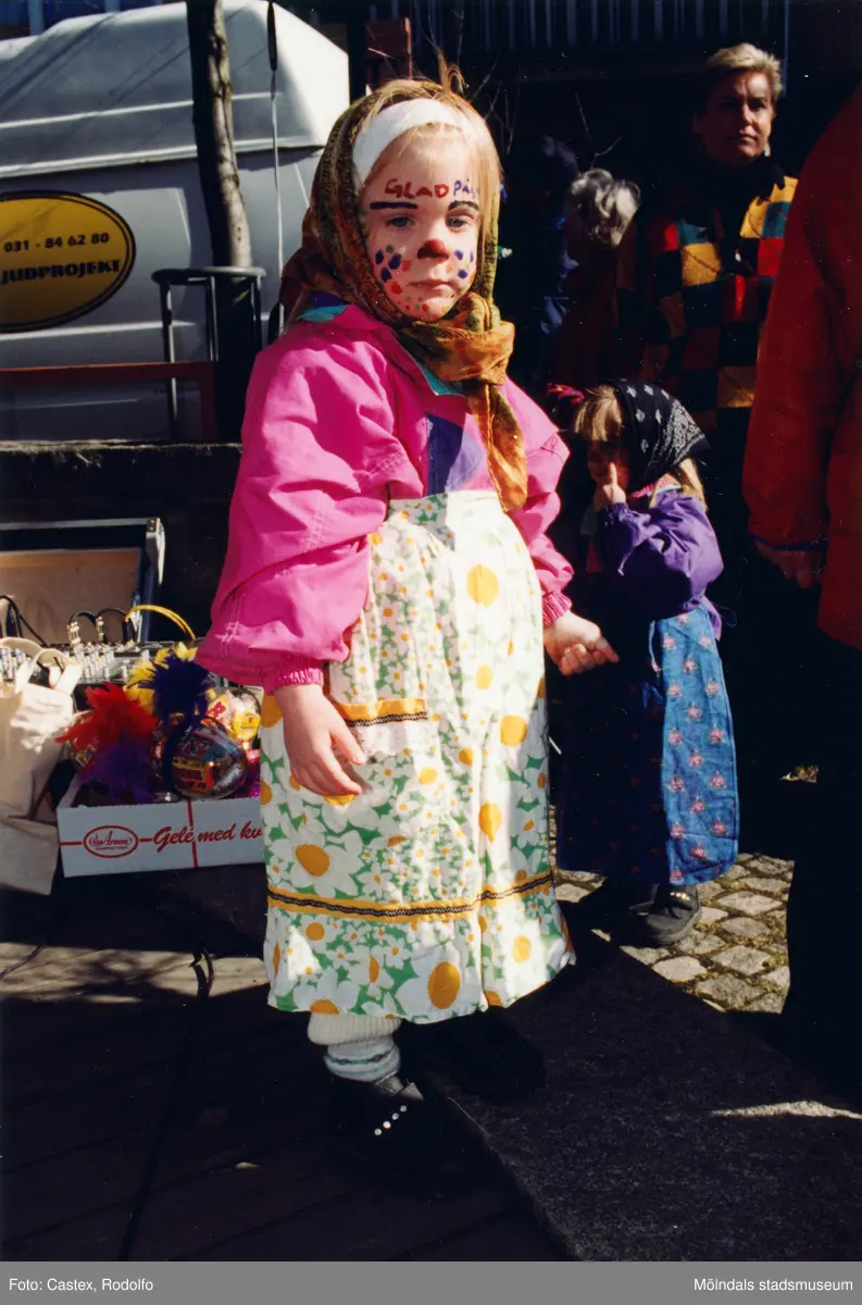 Påskfirande på Mölndals torg på 1990-talet. Porträtt av en påskkärring.