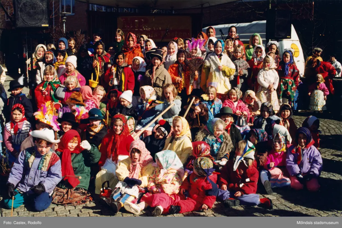 Påskfirande på Mölndals torg på 1990-talet. Porträtt av påskkärringar och påskgubbar.