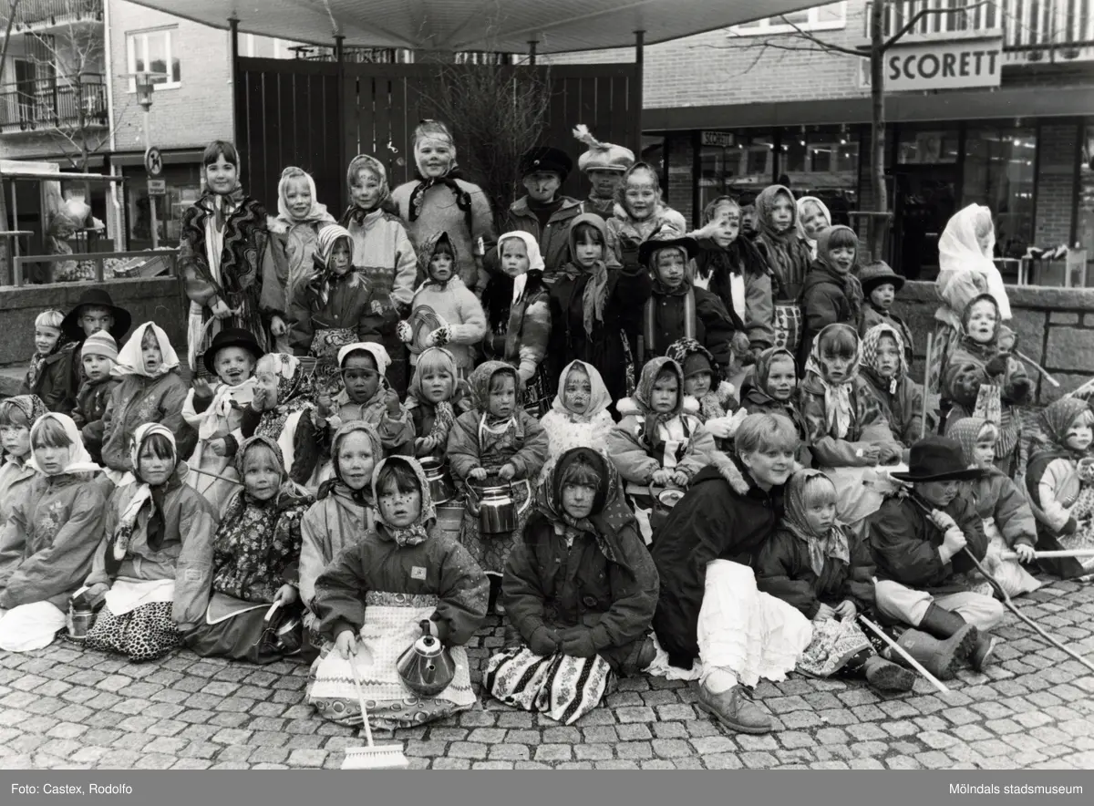 Titel: Påskfirande på Mölndals torg, år 1991. Porträtt av påskkärringar och påskgubbar.