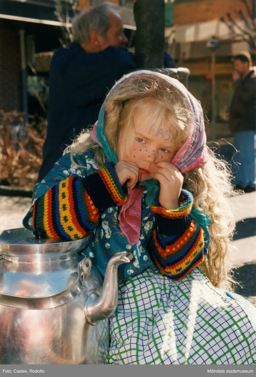 Påskfirande på Mölndals torg i mars 1997. Porträtt av en påskkärring.