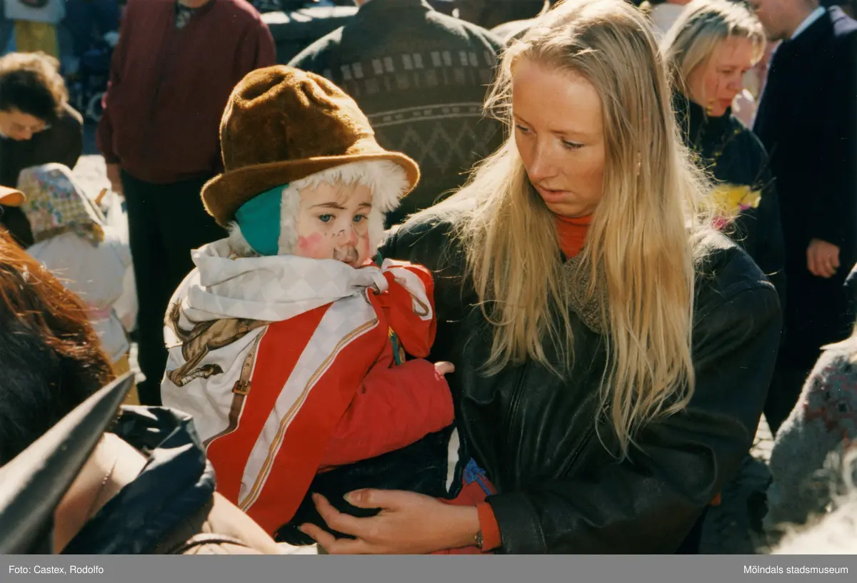 Påskfirande på Mölndals torg i mars 1997. Porträtt av en kvinna med en påskgubbe i famnen.