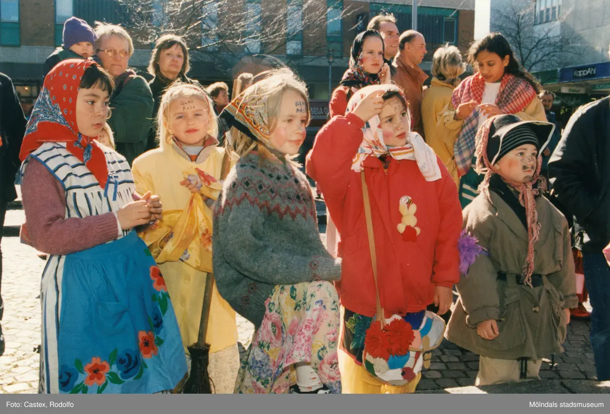 Påskfirande på Mölndals torg i mars 1997. Porträtt av påskkärringar och en påskgubbe.