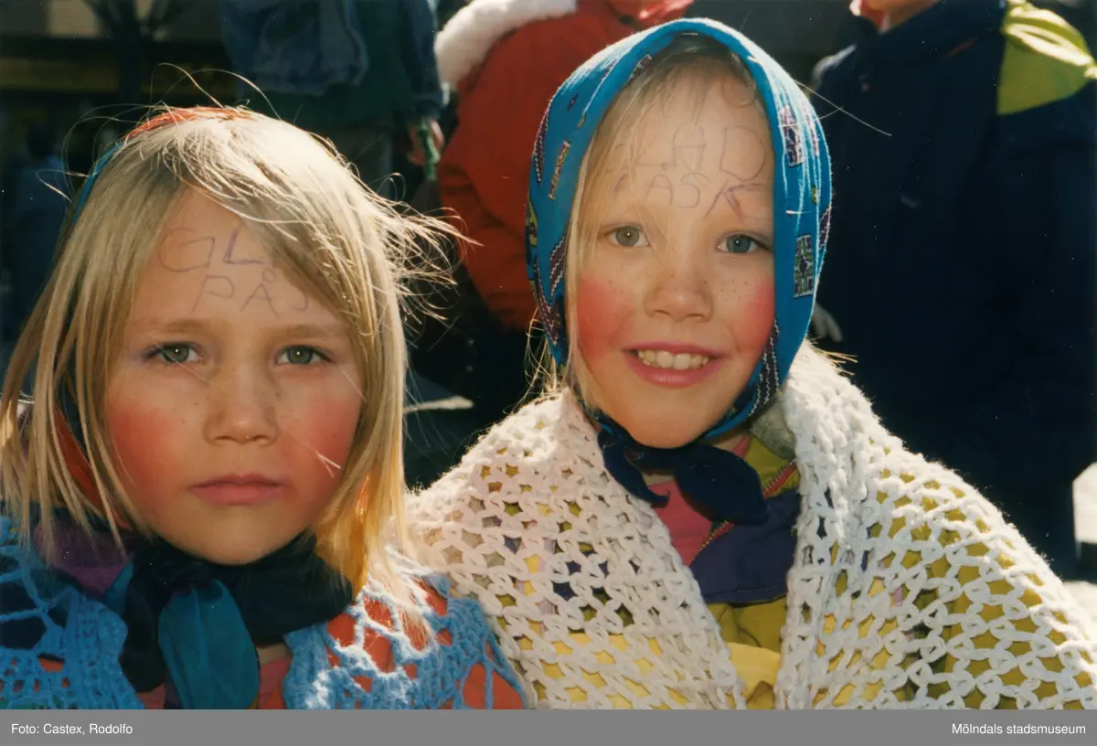Titel: Påskfirande på Mölndals torg i mars 1997. Porträtt av två påskkärringar.