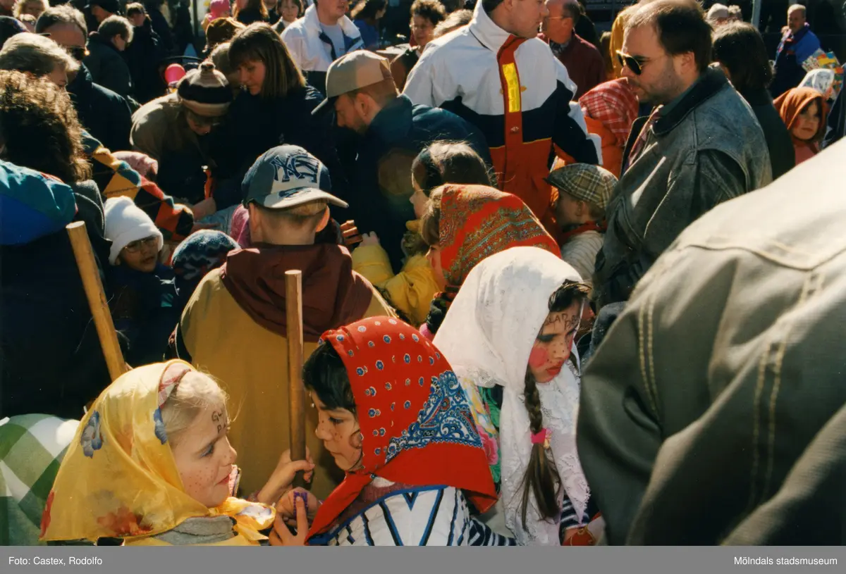 Påskfirande på Mölndals torg i mars 1997. Påskkärringar i folkvimlet.