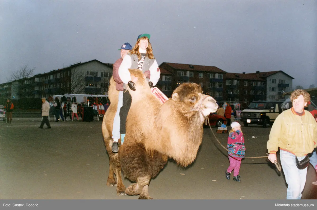 Jitex BK knallemarknad på Frejaplan i Mölndal, oktober 1993. Kamelridning på marknaden.