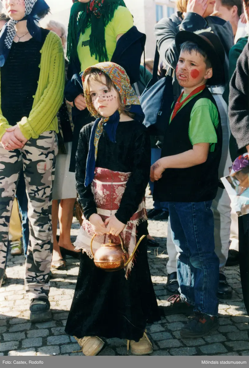 Påskfirande på Mölndals torg lördagen den 3 april 1999. En påskkärring och en påskgubbe på torget.