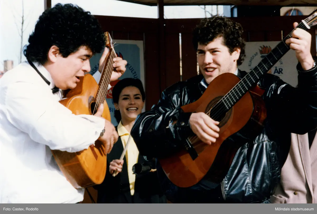 Titel: En utländsk musikorkester ger en konsert på Mölndals torgs scen, okänt årtal.