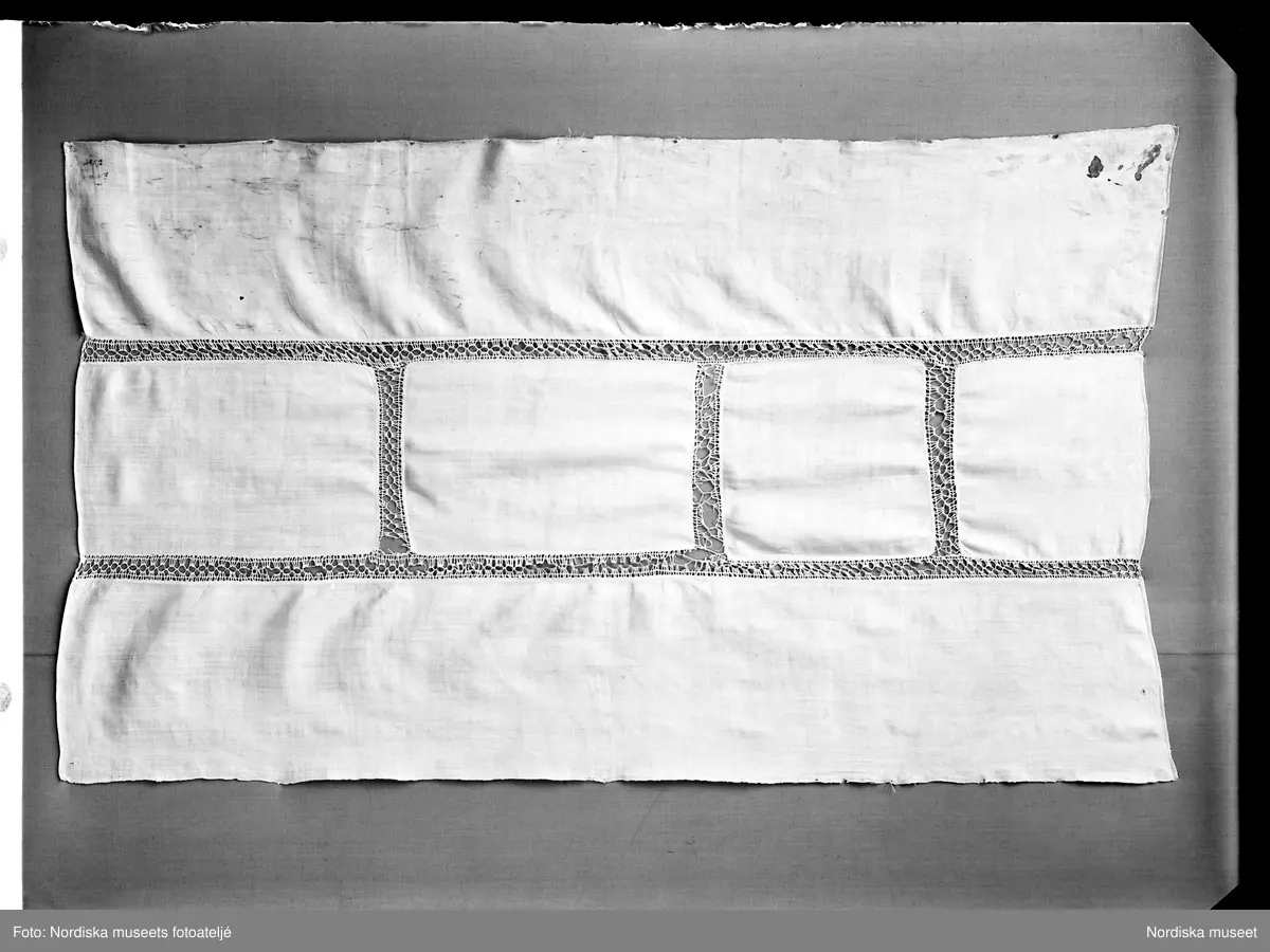 Katalogkort med foto. Påskrift H-b-f. Ovanåker Väggduk, knyppling. Hälsingland Ovanåkers sn. L. 106 cm., br. 180 cm. Lärft av (otydligt) ling., 14 tr. på 1 cm. Spetsar 4 cm. br. knypplade av (otydligt) ling. "När den köptes av föreningen hängde den uppsatt på väggen i klädhvisten (?) i gården." Äg: Ovanåkers hembygdsförening Ovanåker. Lån 1935. E.U.9214.