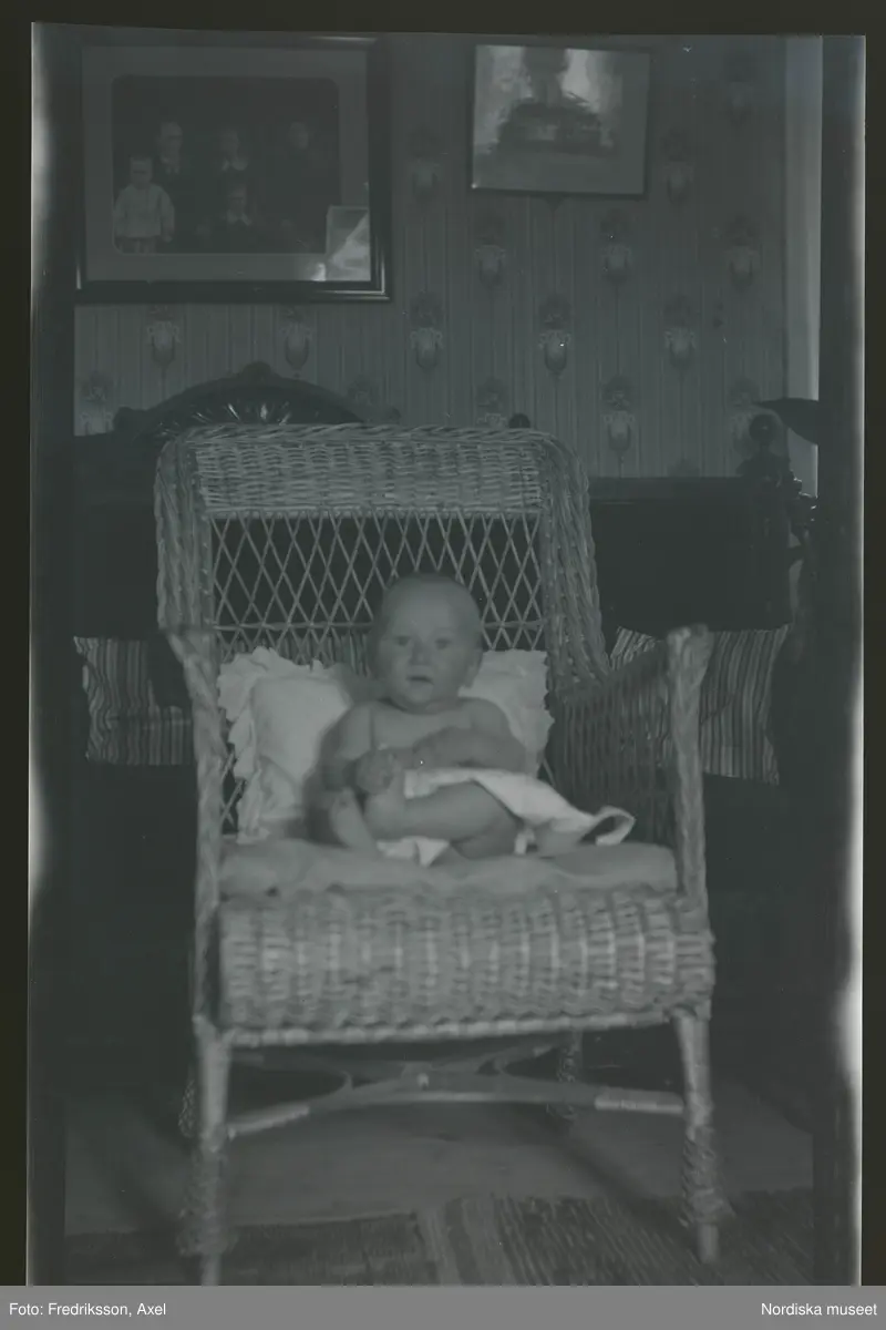 Titel: Porträtt av ett litet barn sittandes i en korgstol.