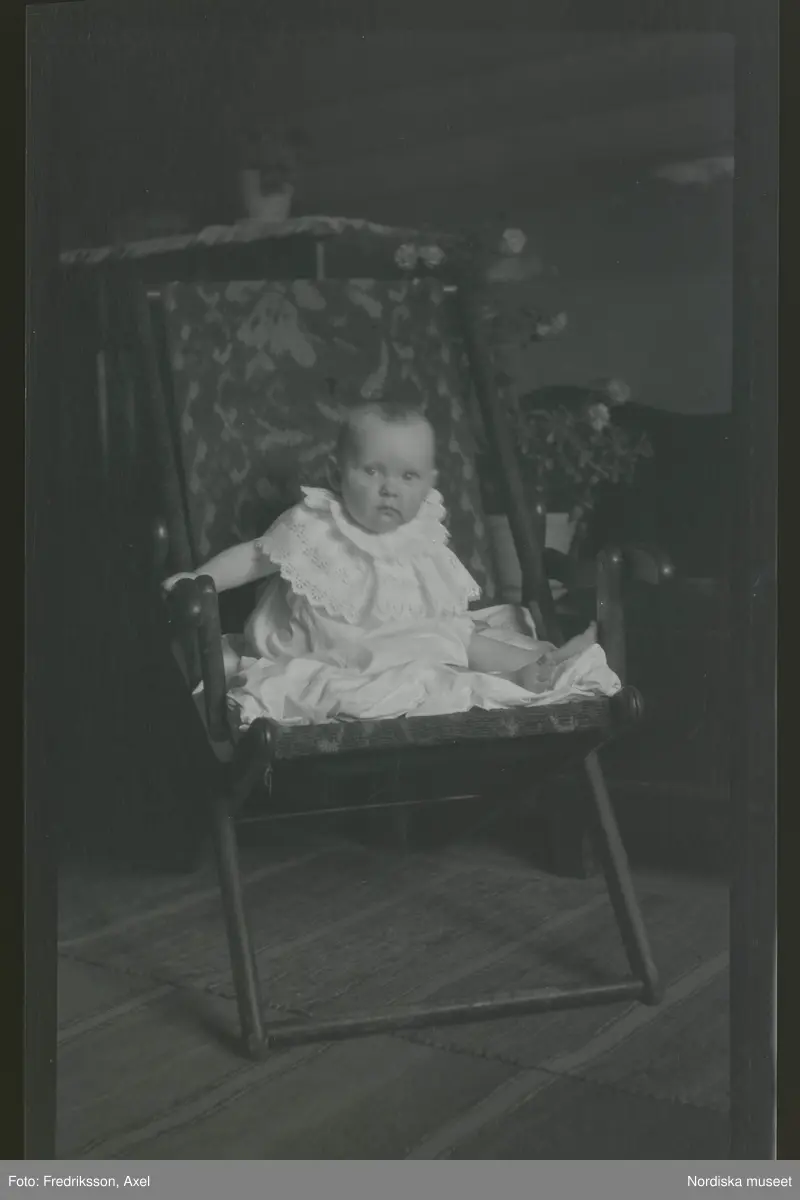 Porträtt av ett litet barn sittandes i en fällbar stol.