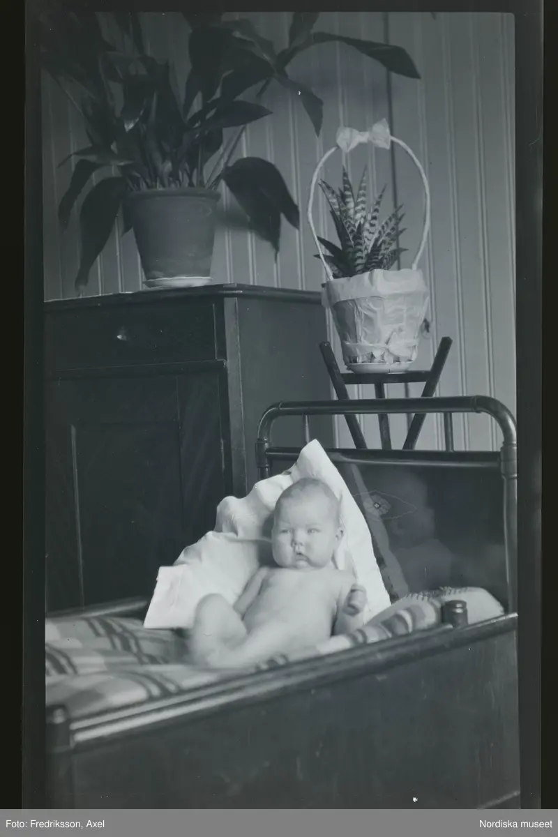 Porträtt av ett litet barn i en säng.