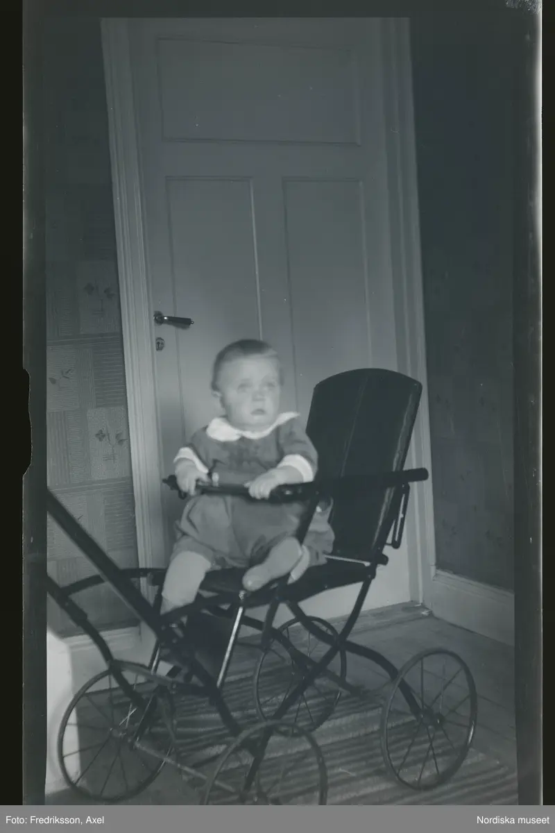 Porträtt av ett litet barn sittandes i en barnvagn, inomhus.