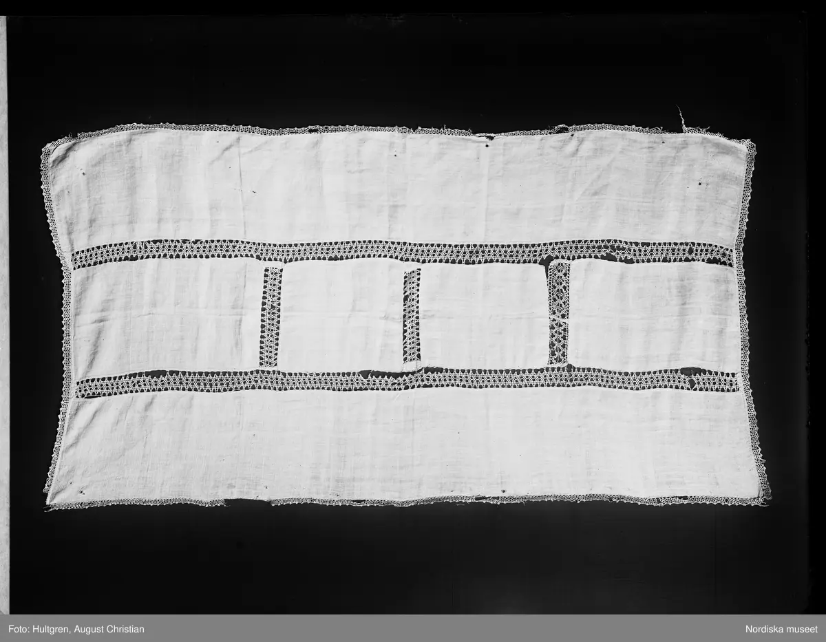 Katalogkort med foto. Påskrift Väggduk m. knyppling. Hälsingland Ovanåkers sn. Av linne med knypplad spets 2,00 x 1,07 m. Hultgren fot. 1911.