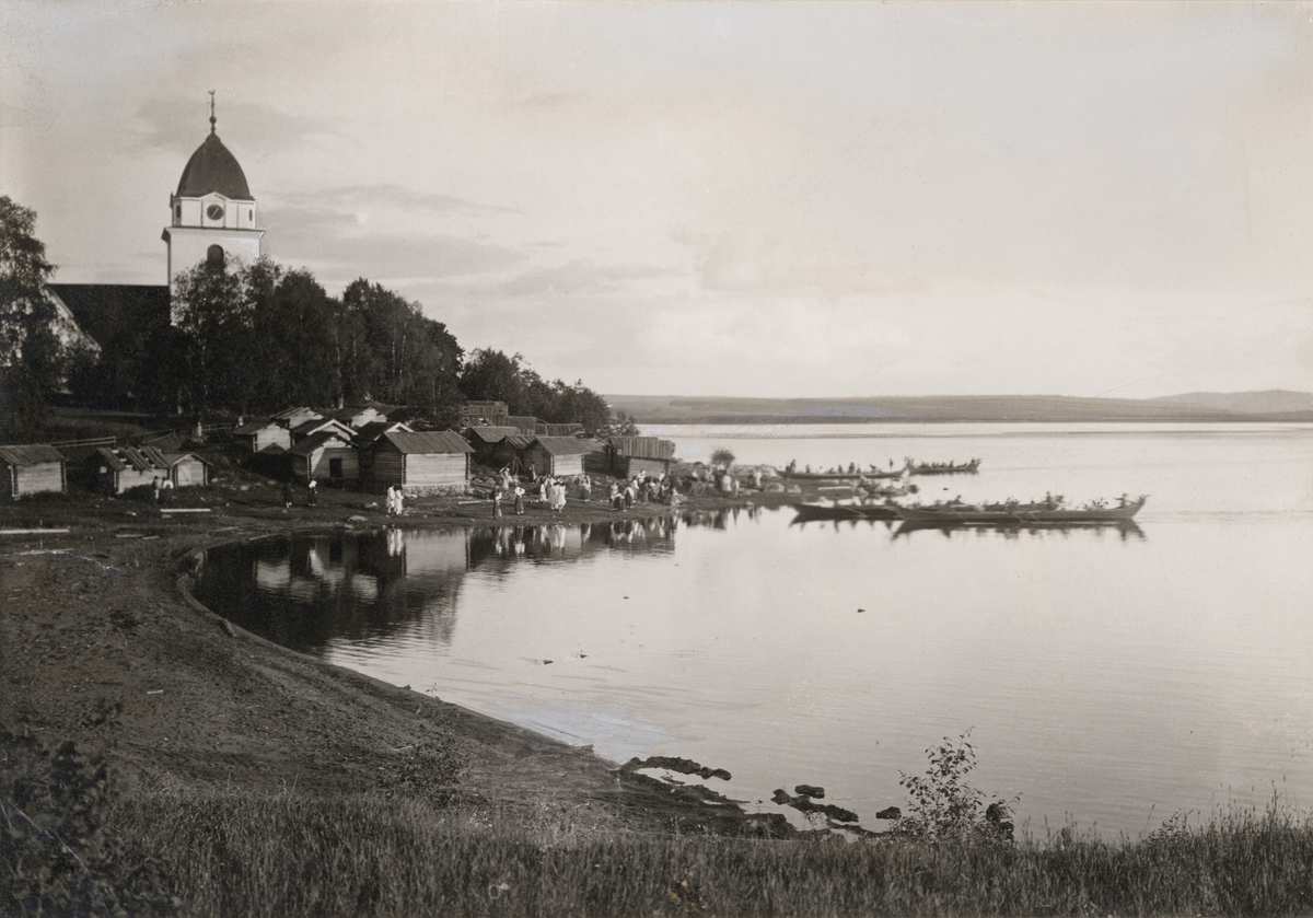 Rättviks kyrka i Dalarna. Kyrkbåtar på Siljans vatten. Vid stranden framför kyrkstallarna står högtidsklädda människor.